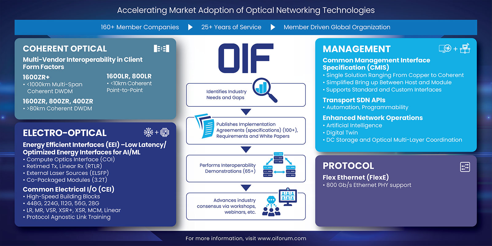 Acacia believes in open networking and is proud to be actively involved in driving standards and multi-vendor interoperability collaborations that support rapid time to market and economies of scale. Acacia has made significant contributions to multiple OIF implementation agreement efforts and other industry standards including co-authoring OIF 400ZR project start and editor, actively driving 800ZR and 800G ZR+, co-authoring OIF 1600ZR project start, and was an OpenZR+ MSA founder member and co-chair.